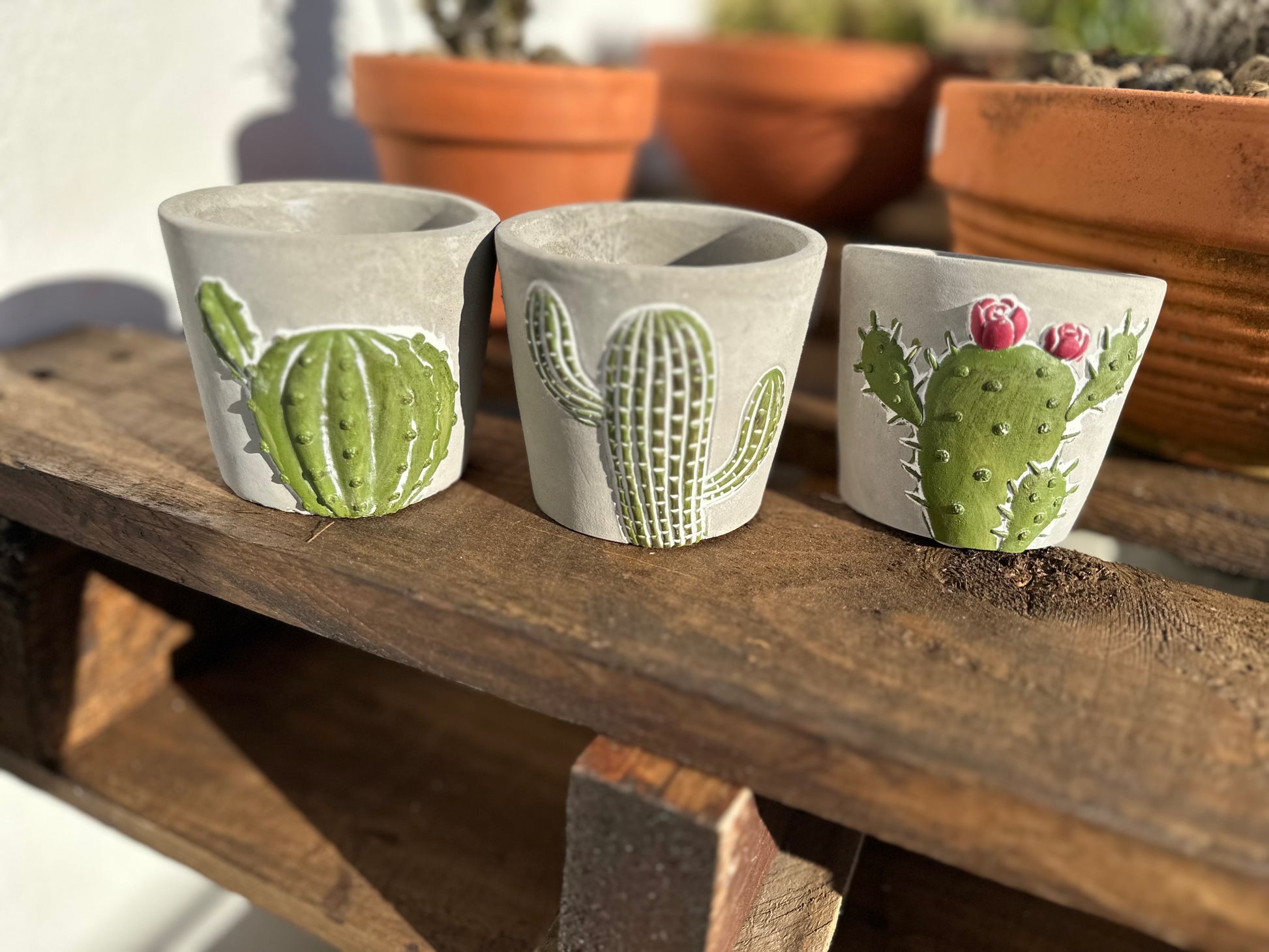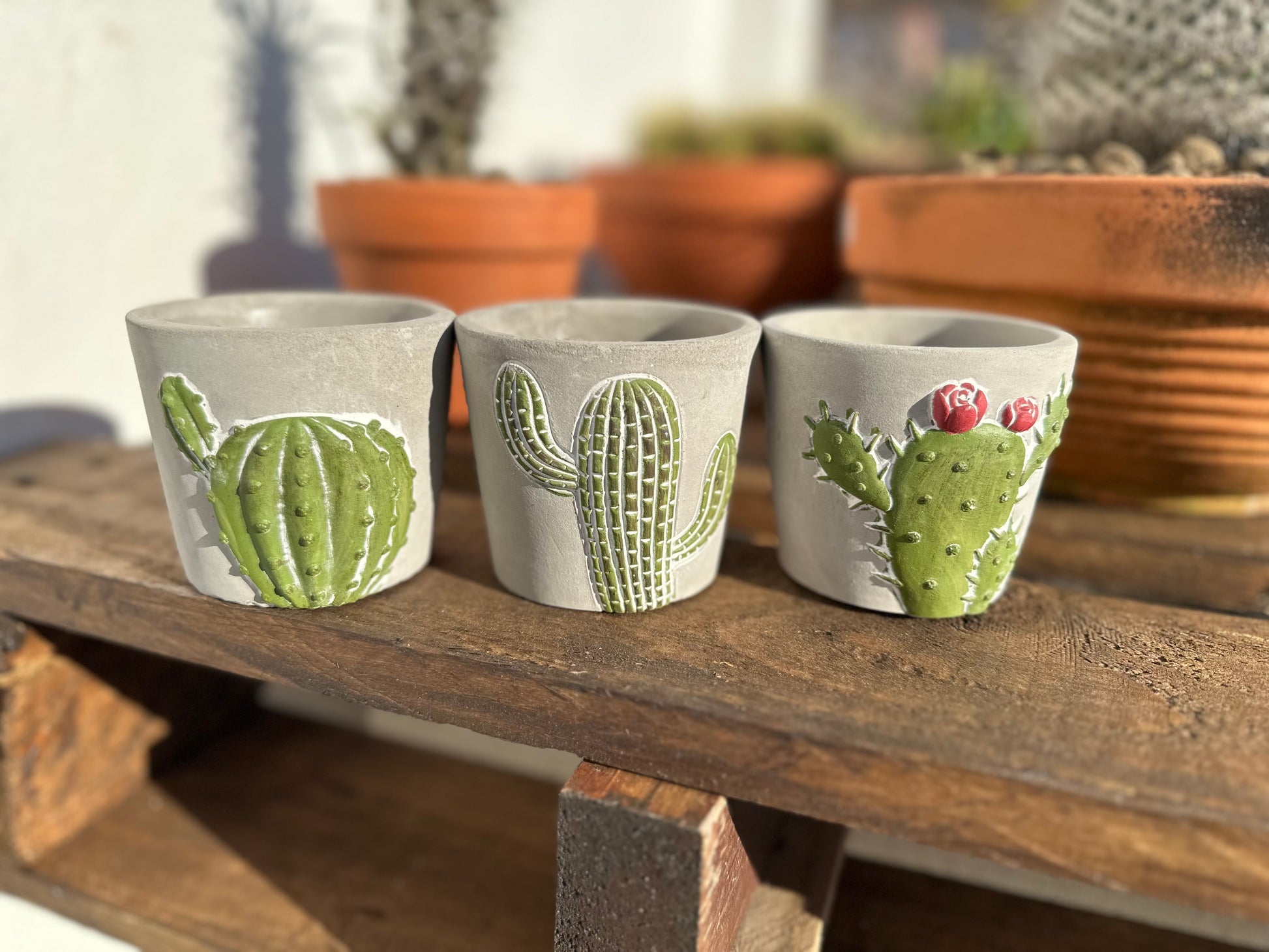 Nuestras macetas decorativas mini son pequeñas piezas de diseño que combinan la resistencia del cemento con un delicado motivo de cactus. Cada una está pensada para darle un toque especial y original a cualquier rincón, perfectas para suculentas o cactus de pequeño tamaño.